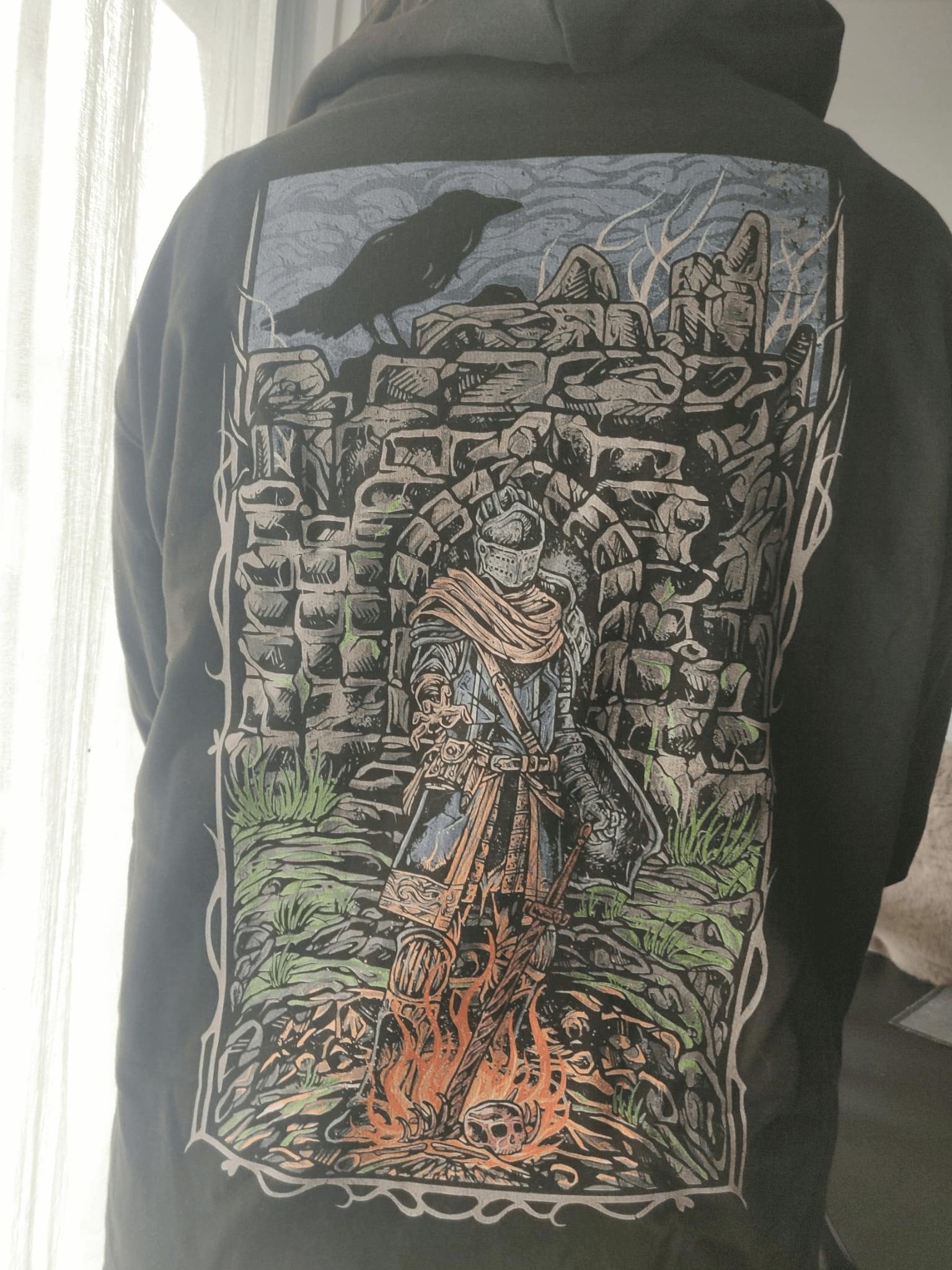 This Souls-inspired hoodie captures the iconic moment of the Chosen Undead resting at Firelink Shrine, surrounded by ruins and the guiding flame. Featuring moody artwork steeped in solitude and hope, this high-quality sweatshirt blends comfort with durability. Ideal for those drawn to legendary beginnings and the eternal bonfires of Lordran.