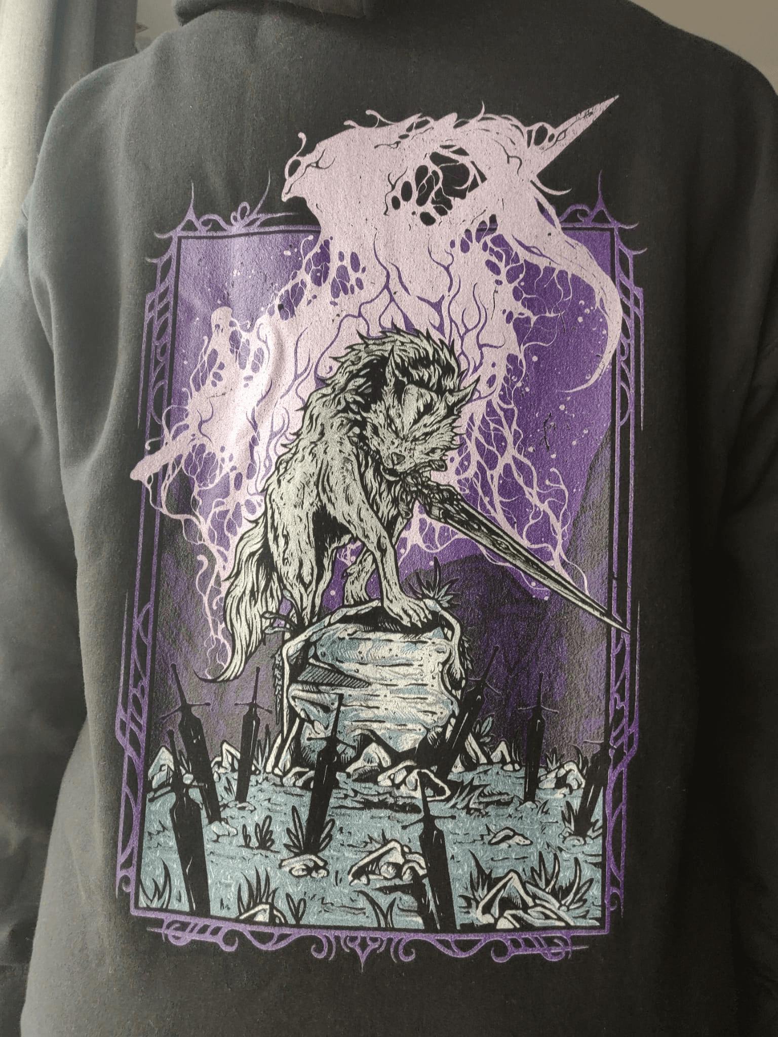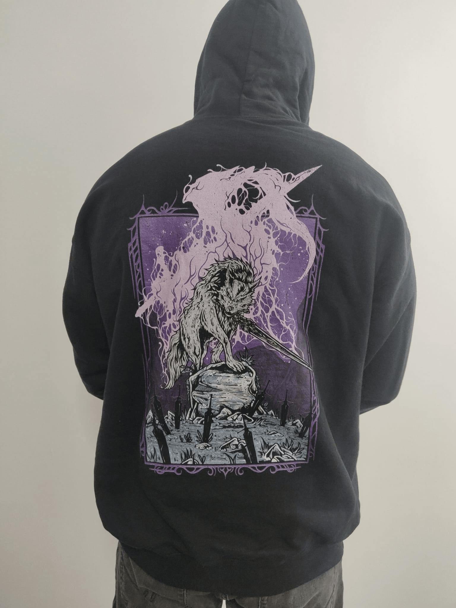 This Souls-inspired hoodie pays tribute to Sif, the Great Gray Wolf, standing proudly with Artorias’s greatsword in his jaws. Featuring stunning artwork that embodies loyalty and strength, this durable, high-quality sweatshirt ensures lasting comfort. Ideal for hollows who revere the timeless tale of friendship and duty beneath the fading flame.
