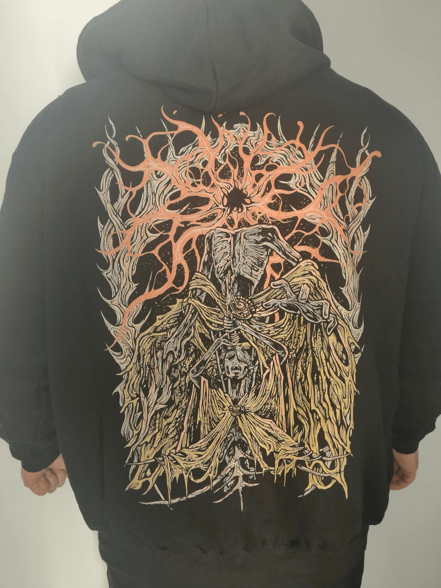 This Lands Between-inspired hoodie features Midra, failed Lord of the Frenzied Flame. The detailed artwork captures the chaotic fury of the Frenzied Flame, echoing the madness that burned his followers and the torment he endures in the forbidden Abyssal Woods. Sealed by the Hornsent and pierced by the Greatsword of Damnation, Midra remains a symbol of ambition and suffering. A high-quality piece, perfect for Tarnished drawn to the dark path of the Three Fingers.